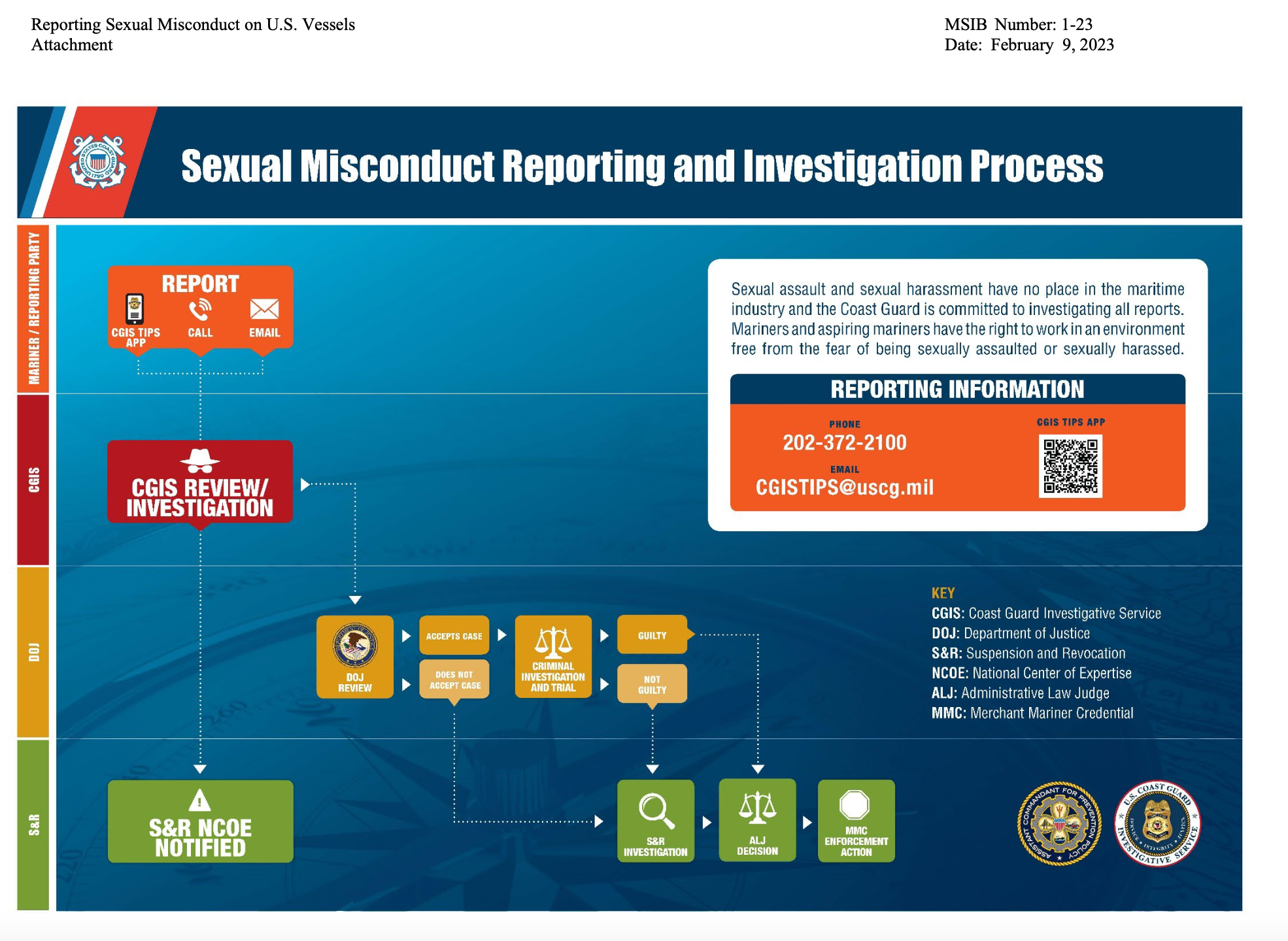 Coast Guard Suspension and Revocation (S&R) proceedings: Once a report is made, the Coast Guard may investigate whether the alleged perpetrator's merchant mariner credentials should be suspended or revoked. This is an administrative process, not a criminal prosecution and focuses on the mariner's fitness to hold a credential, not on jail time. However, the Coast Guard's investigation may also involve interviewing you and creates an official record that may be accessible under the Freedom of Information Act.